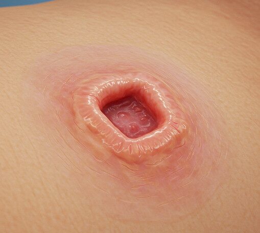 - Stage 4: Full-thickness tissue loss with exposed bone, tendon, or muscle. Slough or eschar may be present. Often includes undermining and tunneling.